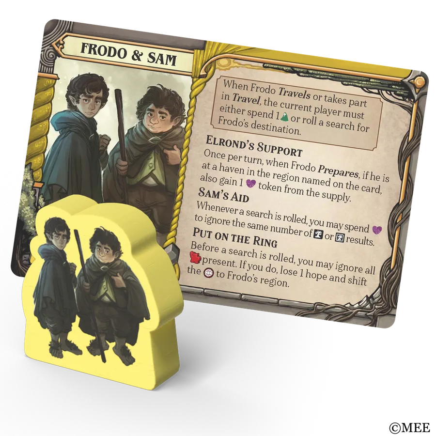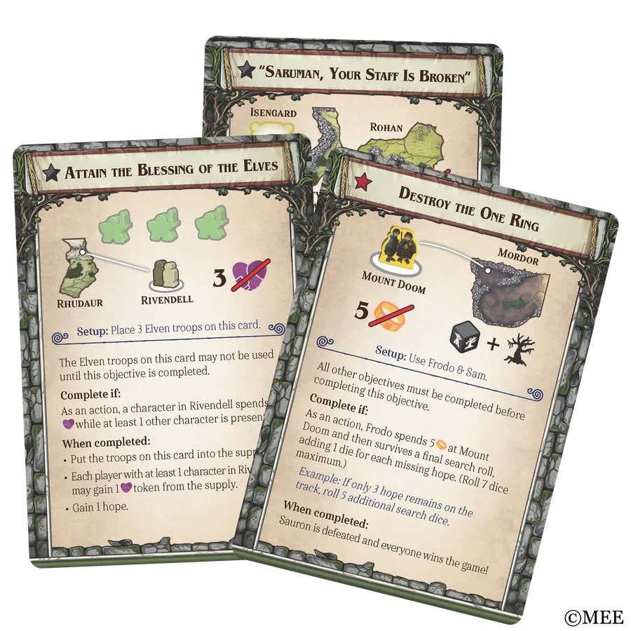 Each playthrough presents new challenges with 24 different objectives, 14 events, and 13 playable characters. The game is won if the group destroys the One Ring before Frodo loses all hope.